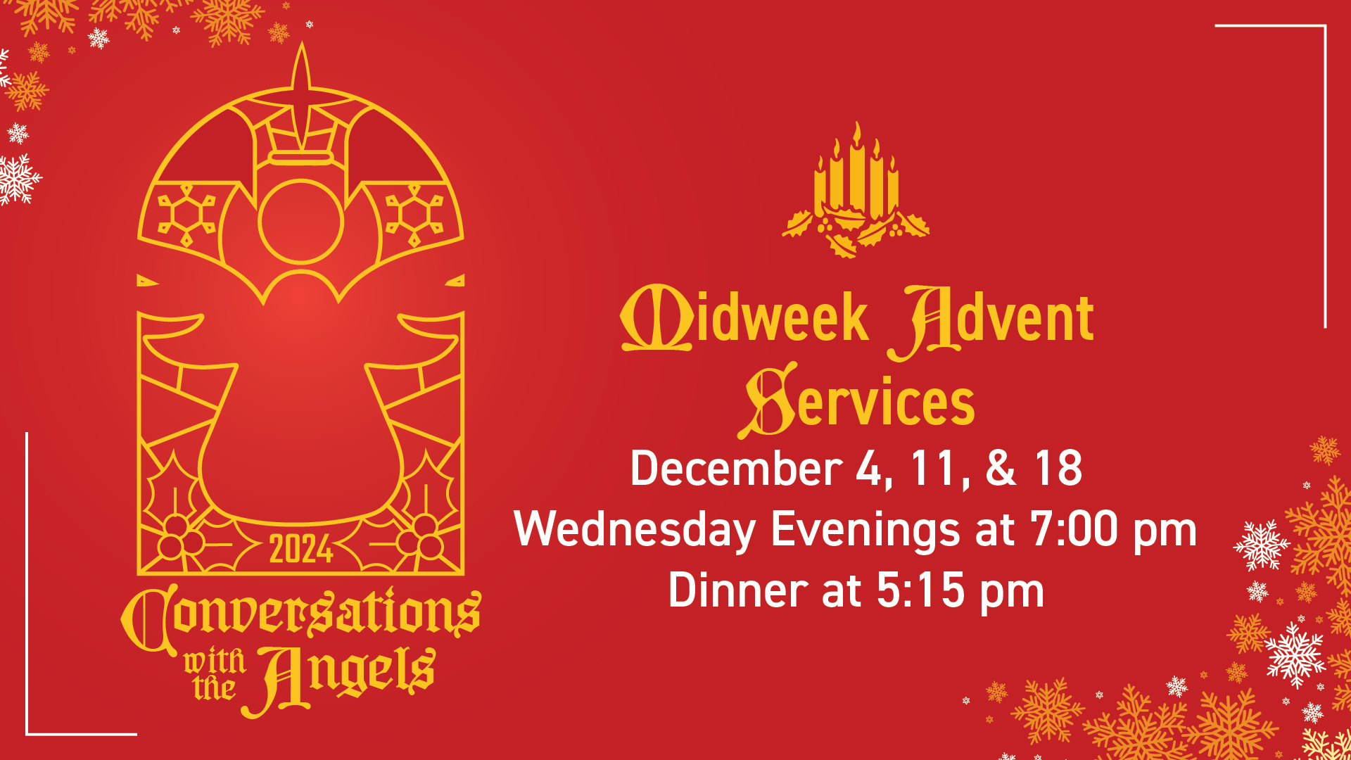 Each Wednesday evening in December, we’ll gather for a warm, home-cooked meal at 5:15 pm, followed by a meaningful time of worship and reflection at 7:00 pm.